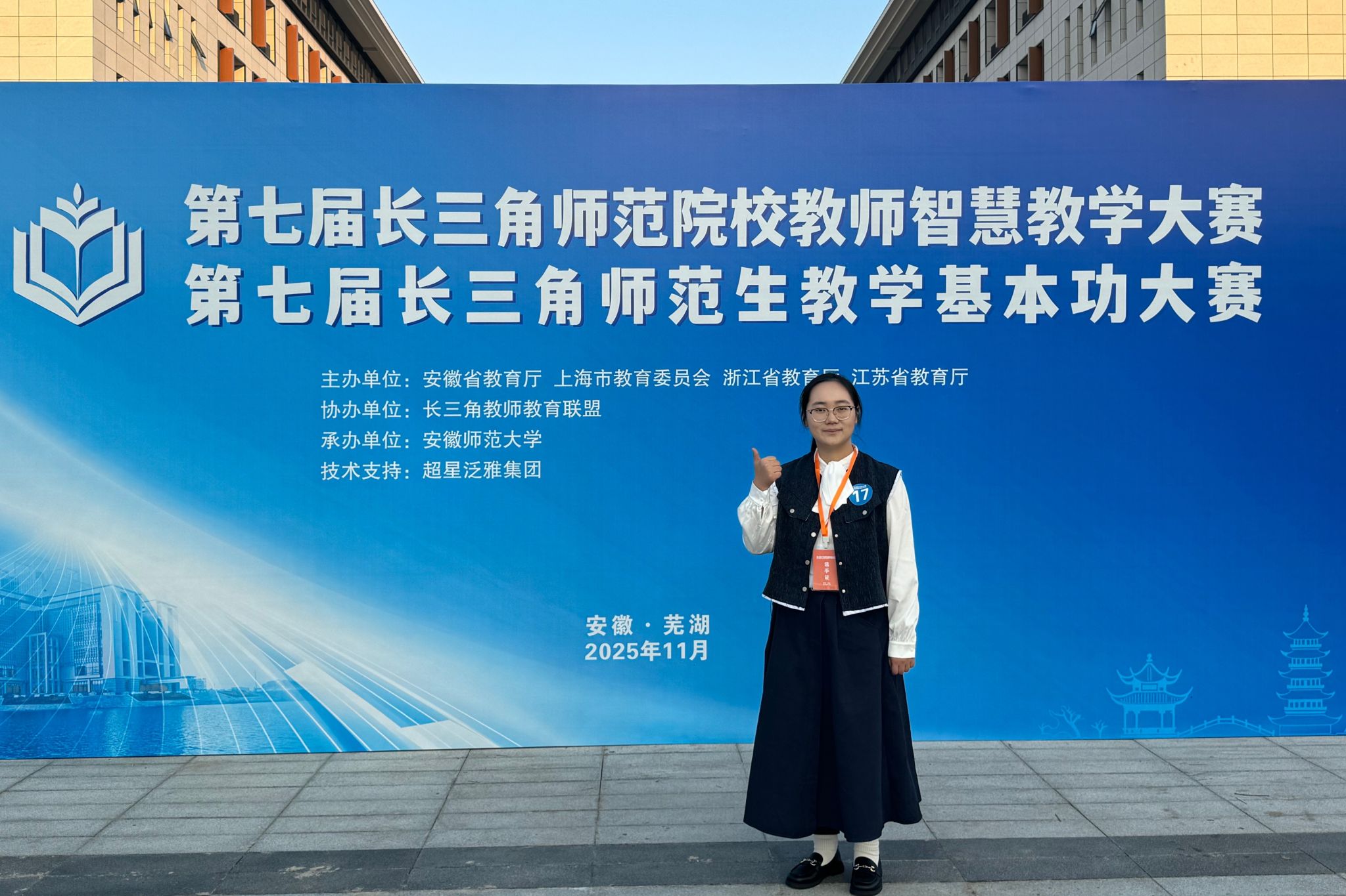 该项赛事是长三角地区师范教育领域极具影响力的赛事,大赛决赛阶段中学组竞赛考核项目由教学设计、课件制作、即席演讲及有生上课四个环节组成。比赛期间,丁菁雯同学依次完成四项核心技能考核,以深刻的教育思考、严密的学科逻辑和沉稳笃定的临场发挥,充分彰显了扎实的教学功底与良好的综合素养。