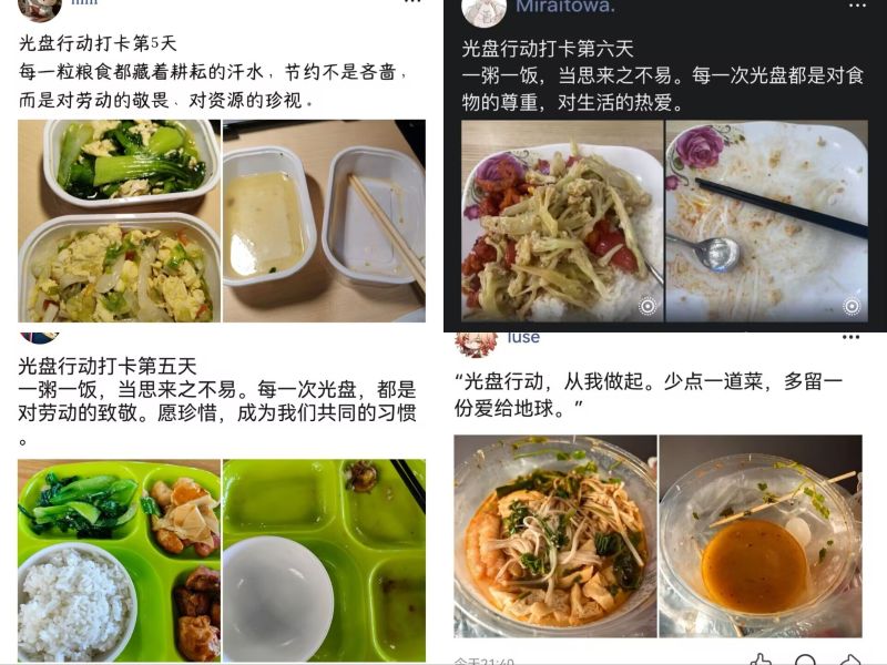活动前夕,“光盘打卡”活动掀起学生参与热潮。同学们通过小红书、朋友圈等社交平台,主动上传餐后空盘照片,将爱粮节粮理念融入日常用餐当中,以实际行动践行勤俭节约的传统美德,在校园内营造出“光盘光荣、浪费可耻”的良好氛围。