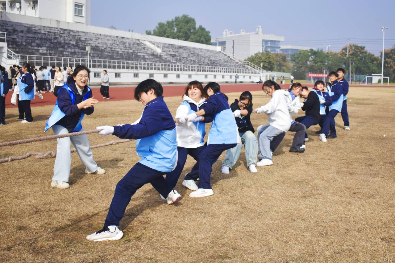 临近午间,“群龙取水”与“师生拔河”项目相继登场。“群龙取水”中,各团队在起点线外协作取水,严格遵守不碰地面、不借外物的规则,助教交叉计时确保公平;“师生拔河”中,双方队员紧握绳索、奋力拼搏,将上午的活动氛围推向高潮。