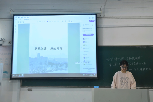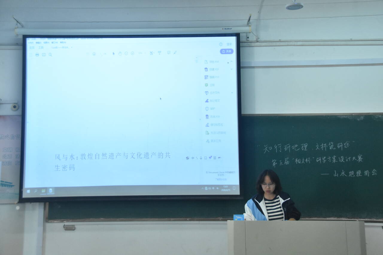 汇报当天,现场气氛活跃而有序。各参赛队伍轮番登场,选题涵盖盐城、淮安、敦煌、重庆等多个地理区域。同学们准备充分,以清晰的逻辑和饱满的热情,系统讲解研学主题的选定依据、活动设计、实施步骤及预期成果。汇报内容兼顾自然地理与人文地理视角,充分展现了地科学子扎实的专业功底与良好的学术创新能力。