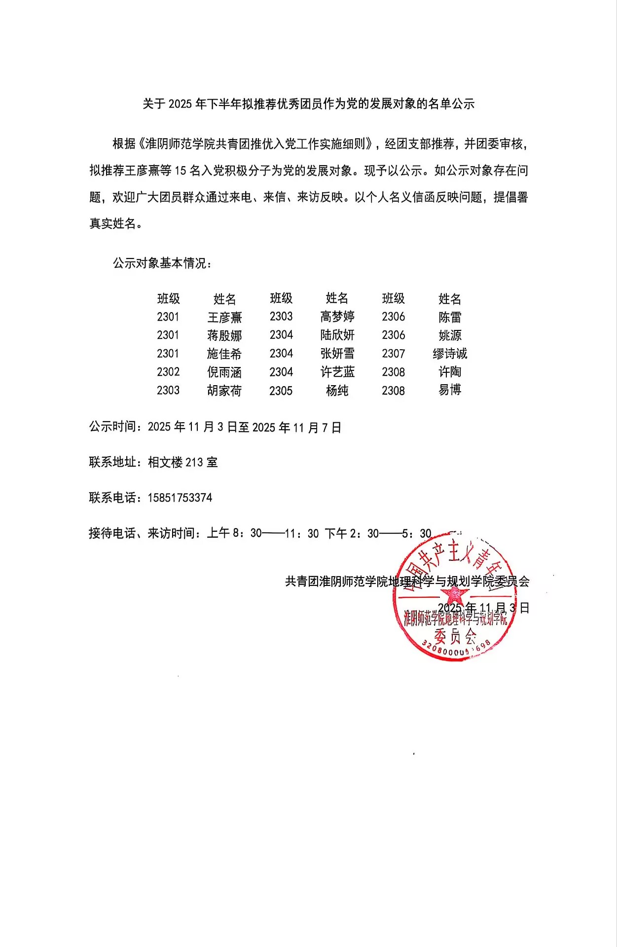 【公示】关于2025年下半年拟推荐优秀团员作为党的发展对象的名单公示