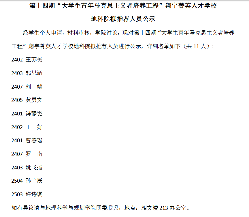 【公示】第十四期“大学生青年马克思主义者培养工程”翔宇菁英人才学校学员拟推荐人员公示(地科院)